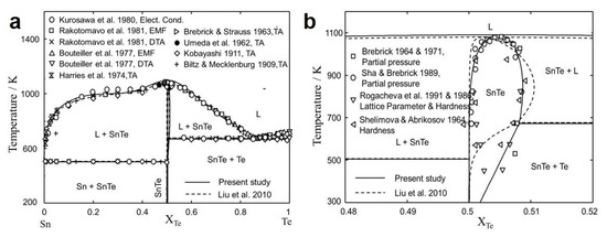 The Sn-Te phase diagram consists of two eutectic reactions and one intermediate congruently melting phase, SnTe. This binary system has been thermodynamically assessed by various authors [52,53,54,55,56,57]. Hsieh et al. [52], Kattner et al. [53], Sharma and Chang [57], Kuznetsov [54], and Liu et al. [56] used an associate solution model with SnTe as an associate component, whereas Merzhanov et al. [55] used a formal mathematical model. All proposed thermodynamic descriptions can satisfactorily reproduce reported experimental thermodynamic and phase diagram data in this system. However, Hsieh et al. [52] and Kattner et al. [53] used old thermodynamic descriptions of the pure elements, and Kuznetsov [54] and Sharma and Chang [57] obtained model parameters that were not consistent with other CALPHAD type modeling. They have extensively reviewed the available thermodynamic data and those data were employed in the present study to determine the model parameters for this binary system. Biltz and Mecklenburg [58], Kobayashi [59], Umeda et al. [60], and Harries et al. [61] used thermal analysis to measure the liquidus temperature. Brebrick and Strauss [62] measured the partial pressure of Te2 over SnTe and determined the liquidus temperature near the SnTe region. Rakotomavo et al. [63] and Le Bouteiller et al. [64] determined the liquidus temperature using EMF measurements and DTA analysis. Rakotomavo et al. [63] reported Eutectic temperature 507±1 K on Sn rich side and 673 ± 1 K on Te rich side based upon DTA measurements. Le Bouteiller et al. [64] reported eutectic temperature 675 ± 2 K in Te rich side. Kurosawa et al. [65] measured the electrical conductivity of the liquid Sn-Te system to determine the liquidus. Brebrick [66,67] determined the homogeneity range of the intermetallic compound SnTe by measuring the partial pressure of Te2 over SnTe and lattice parameter measurements. Shelimova and Abrikosov [68], Sha and Brebrick [69], and Rogacheva et al. [70,71] determined the homogeneity range by hardness, partial pressure measurements, and lattice parameter as well as hardness measurements, respectively. The calculated phase diagram of the Sn-Te system is shown in Figure 3a along with experimental data [58,59,60,61,62,63,64,65] and the most recent optimization [56]. The calculated enlarged homogeneity range of the SnTe compound is shown in Figure 3b along with experimental data [66,67,68,69,70,71]. As seen in Figure 3b, compared to the previous calculation by Liu et al. [56], the calculated homogeneity range of the SnTe is in good agreement with the experimental data.