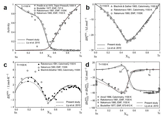 Calculated thermodynamic properties at 1100 K (a) activity of Sn (l) and Te (l), (b) mixing enthalpy of liquid, (c) mixing entropy of liquid, and (d) partial enthalpy of Sn (l) and Te (l) in liquid solution along with respective experimental data from [63,64,72,73,74,75].