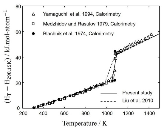 where, , and are standard enthalpy of formation from the stable pure elements at 298.15 K, entropy at 298.15 K, and heat capacity, respectively. The heat capacity expression of each compound can be determined by fitting heat capacity data. The Neumann–Kopp rule [33] can be used to predict the expression in case of no available reliable data on.