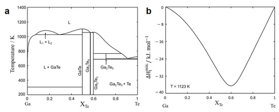 The optimized result of the Ga-Te binary system by the authors’ recent study [29] was directly adopted in the present study. The optimized phase diagram and the integral enthalpy of mixing of liquid solution were shown in Figure 6a,b, respectively. The liquid immiscibility at the Ga-rich side and the asymmetric enthalpy curve were described well by using MQM with the modification of the coordination number ratio between Ga and Te as .