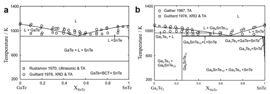 Calculated vertical section of (a) GaTe-SnTe and (b) Ga2Te3-SnTe quasi-binaries along with respective experimental data from [86,87,88,89].