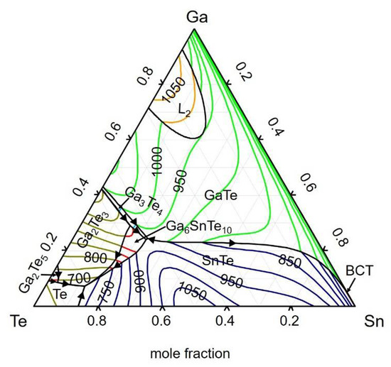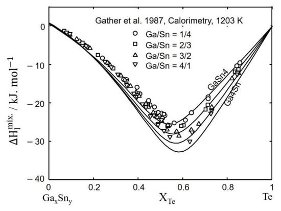 As a first approximation of Gibbs free energy of the ternary liquid solution in the Ga-Sn-Te system, “Toop-like” asymmetric approximation [91] with Te as the asymmetric component was used. One adjustable ternary model parameter was added to avoid unexpected expansion of liquid miscibility gap toward the Sn-rich side. It was solved by increasing the stability of the ternary liquid solution with small negative parameter, = −8900. The calculated vertical section GaTe-SnTe and Ga2Te3-SnTe are shown in Figure 7a,b along with experimental data [86,87,88,89], respectively. The predicted liquidus is in good agreement with the respective experimental data [86,87,88,89]. The calculated mixing enthalpy of liquid GaxSny-Te is shown in Figure 8 along with experimental data [86]. The enthalpy of mixing decreases with increasing Ga/Sn ratio due to the higher contribution of Ga-Te, which is more negative than liquid Sn-Te. The same tendency was observed in the experimental data measured at 1203 K with Ga/Sn ratio. The calculated liquidus projection over the entire composition range of the ternary system Ga-Sn-Te is shown in Figure 9. The black solid lines in the liquidus projection represent the univariant equilibria. The colored lines are isothermal lines calculated at the interval of 50 K. The different types of invariant reactions in this system are given in Table 3.