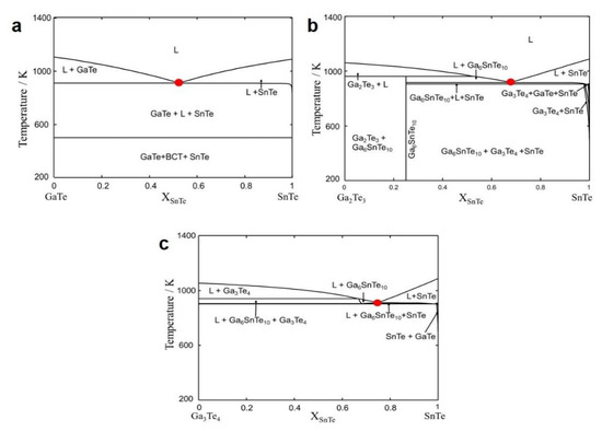 Three vertical sections calculated using the present database in the Ga-Sn-Te system that have great potential as TE materials are shown in Figure 10a–c. The solid red circle in the figure indicates the prospective compositions of the potential eutectic alloys that may be investigated for TE application.