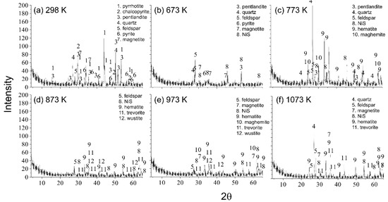 The characterization of the initial pentlandite sample at 298 K and oxidation products at 673 K, 773 K, 873 K, 973 K and 1073 K was conducted by an X-ray diffraction method on a polycrystalline powder sample. The results of the X-ray analysis of the initial sample and oxidation products at different temperatures are given in Figure 1. In the initial ore sample, at room temperature, the following sulfide minerals were observed: pyrrhotite (FeS), pentlandite ((Fe,Ni)9S8), pyrite (FeS2), magnetite (Fe3O4), chalcopyrite (CuFeS2), gangue minerals quartz (SiO2) and feldspar ((K,Na)Si3O8). The most abundant were pyrrhotite and pentlandite, to a lesser extent pyrite and magnetite, while quartz, feldspar and chalcopyrite were significantly less prevalent. According to Figure 1, the decomposition of pentlandite began below 673 K, which was why there was NiS present at 673 K. The intensification of the pentlandite oxidation process occurs below 873 K, that is why the characterization of the oxidation products at 873 K showed no pentlandite. It can be observed that NiS was present even at 1073 K. Since copper minerals were significantly less present, chalcopyrite oxidation products were not shown on the XRD diffractograms of oxidation products at higher temperatures.