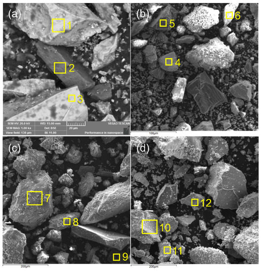 Qualitative chemical analysis of the initial sample was conducted according to EDXRF (Energy-Dispersive X-ray Fluorescence) analysis, on an analyzer (Canberra Packard, Schwadorf, Austria) with radioisotopes for Cd-109 excitation (22.1 keV). The weight of the sample was 0.5 g. Quantitative chemical analysis was carried out using atomic adsorption spectrometry (AAS) (AAS PinAAcle 900 T, PerkinElmer, Überlingen, Germany). Examined samples (in three replicates) were previously dissolved by the nitric–perchloric acid digestion method described by Hseu [33], and the contents of selected inorganics were determined from the solution. A part of Si that remained undissolved in the form of a precipitate was further determined by the hydrochloric acid dehydration (gravimetric) technique [34].