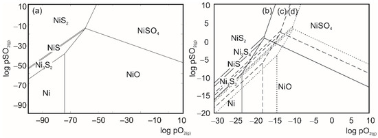 with a partial pressure of oxygen 0.1 bar. Calculated diagrams (Figure 5) imply that during an oxidation process, Ni and Fe sulfates were expected to form even at lower temperatures.