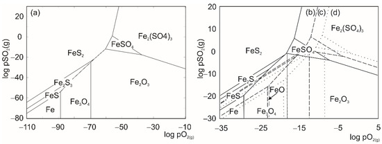 Kellogg diagrams constructed for Fe-S-O system at (a) 298 K, (b) 773 K, (c) 923 K and (d) 1073 K [37,38].