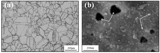 Initial microstructure of superalloy GH4169: (a) the grain microstructure; (b) the γ′′ and γ′ phases.