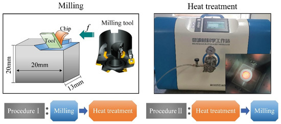 The effects of sequential processes of milling (down-milling) and solution heat treatment on work hardening were experimentally studied. Two sequential processes of manufacturing GH4169 were designed. In the process of M + HT, the workpiece was machined with a milling operation, then handled by solution heat treatment. The workpiece was manufactured with solution heat treatment and a subsequent milling operation in another process of HT + M. The sequential processes of manufacturing GH4169 and the nomenclature are shown in Figure 2 and Table 2, respectively.
