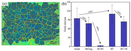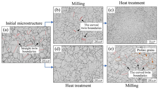 Surfaces with a different microstructure were obtained by the two sequential production processes. In the M + HT process, a small degree of plastic deformation (a small number of curved twin boundaries) occurred on the workpiece surface followed by recrystallization. Finally, a surface without plastic deformation with fine grains was obtained. In contrast, in the HT + M process, grains grew first, then a large degree of plastic deformation (more curved twin boundaries and prolate grains) occurred on the machined surface. Finally, a plastic deformed surface with large grains was obtained.