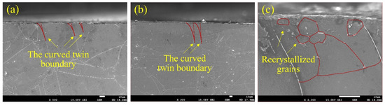 The microstructures of the cross-section near the machined surface processed in the sequential production processes are shown in Figure 4a–c. As shown in Figure 4a,b, the red curves represent the position of the twin boundary before and after the machining process. After the as-received GH4169 was machined, the bending deformation degree of the twin boundary was small, characterized by the position of the solid line and the dotted line, and the deformation depth was about 15 μm. By comparison, the deformation depth of the twin boundary was about 40 μm for the workpiece processed by the HT + M process. The deformation degree of the HT + M workpiece was much larger than that of the M workpiece. Figure 4c shows the microstructure of the cross-section of the workpiece processed by the M + HT process. The red curves in Figure 4c represent the grain boundaries of the recrystallized grain. It can be seen from Figure 4c that the recrystallized grain near the machined surface was the smallest and the depth of the recrystallized area was about 30 μm.