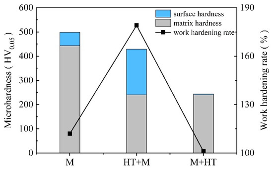 It was found that the surface microstructure of the workpiece underwent changes after the M + HT and HT + M processes were performed on the as-received GH4169. The microhardness of GH4169 is closely related to its microstructure [16]. After the sequential production processes, the surface microhardness was measured for various workpiece conditions, as shown in Figure 6. The bar chart shows the microhardness of the workpiece matrix and the surface (HV0, HV), and the line chart shows the degree of work hardening (HV/HV0 × 100%). It is clear from Figure 6 that there was a significant decrement in the matrix hardness from the as-received GH4169 (443 ± 10 HV0.05) to the heat-treated state (240 ± 5 HV0.05). Thus, it can be concluded that the solution heat treatment made the material soft. Previous studies have shown that heat treatment above 750 °C induced dissolution of γ″ and γ’ nanoprecipitates, which should lead to the strengthening of GH4169 [17,18].