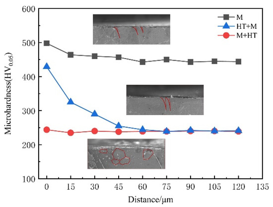 Due to the mechanical load caused by the application of the tool to the workpiece during the cutting operation, not only was the workpiece surface strengthened, but the subsurface microhardness of the workpiece was also changed. Microhardness measurements were tested in cross-section from the machined surface for M, HT + M, and M + HT processes. The microhardness profiles for the three workpiece conditions, beginning from the machined surface and ending 120 μm into the workpiece, are shown in Figure 7. It can be seen from Figure 7 that the microhardness of the cross-section presented a gradient distribution along the depth direction. The microhardness on the surface reached the highest value and then decreased to the value of the matrix area. The HT + M workpiece showed the largest variation of microhardness, followed by the M workpiece. The M + HT workpiece had the smallest variation. Their work hardening depths were 75, 45, and 0 μm, respectively. The HT + M process resulted in a significant hardening gradient and depth on the processed surface of the workpiece, whereas the surface microhardness of the workpiece processed by the M + HT process was the same as that of the matrix; that is, the work hardening caused by the cutting operation was eliminated by the solution heat treatment.
