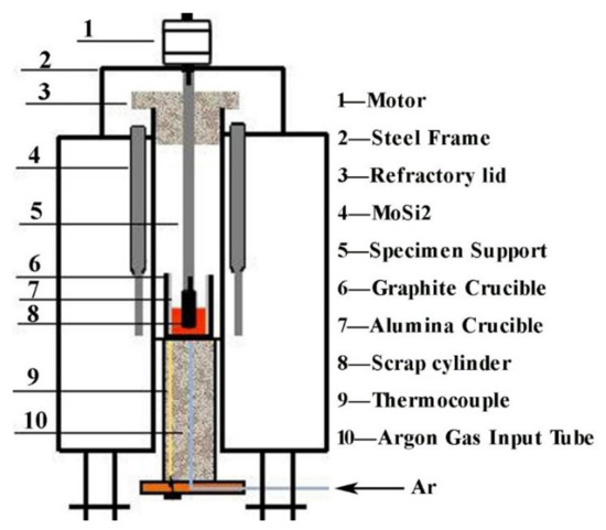 Before each experiment, the scrap cylinders were polished to ensure that their weights and diameters were identical. Argon gas was injected into the furnace to prevent oxidation of the hot metal. When the bath temperature was stabilized at the predetermined value, the scrap cylinders were immersed in the hot metal to a depth of approximately 30 mm without preheating and were held in the metal bath for different durations.