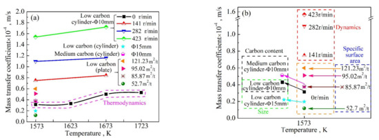 The effect of T on k was also analyzed, and the results are presented in Figure 2a (area enclosed by the pink dashed line). For the stationary specimen, as T was increased from 1573 to 1773 K, k increased from 3.14 × 10−5 to 5.31 × 10−5 m/s, respectively. This was attributed to the high T value under natural convection conditions creating a large temperature gradient between the hot metal and the scrap and subsequently generating a large thermal driving force [16,17]. Therefore, heat exchange between the hot metal and solid scrap was promoted to enhance carbon diffusion.