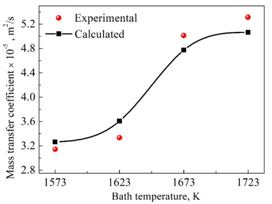During scrap melting, the melting point of scrap is higher than bath temperature (T) owing to the low carbon content of scrap. The large carbon concentration gradient between the low-carbon scrap and the high-carbon molten pool promotes carbon mass transfer from the molten pool to the scrap surface. As the surface carbon content of scrap increases, the melting point of the scrap decreases. Therefore, carbon mass transfer is a critical step during scrap melting. Determining the k values under different conditions can provide a theoretical basis for improving melting efficiency. In previous studies, k (m/s) has been calculated using the melting rate (v; m/s), as follows [4,10,11,12]: