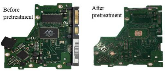 Printed circuit boards (PCBs) are core parts of electric and electronic equipment (EEE) [1,2,3,4,5]. The market of PCBs in Korea grew to 13 trillion Korean won by 2016, and 60% of waste PCBs was recycled, while the rest was exported as used PCBs [6]. Waste PCBs have hazardous pollutants as well as valuable resources, which were recovered by smelters in Korea. However, only three smelters are in operation in Korea, and there is an increasing concern about hazardous gas emission from smelters.