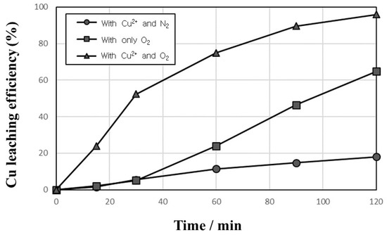 As discussed above, Cu+ ions are extremely unstable in sulfuric acid solution and it is impossible to detect Cu+ as an intermediate in Equations (1) and (2). Therefore, three conditions—Cu2+/O2 addition, only O2 addition, and Cu2+/N2 addition—were compared and the synergetic effect of simultaneous addition of Cu2+ and O2 on the improvement of Cu leaching was confirmed as shown in Figure 2.