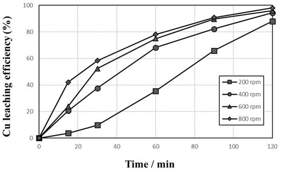 Effects of agitation speed on the leaching behaviors of Cu in 1 mol/L sulfuric acid solution at 90 °C with 10,000 mg/L Cu2+, 1% pulp density, and 1000 cc/min O2 introduction.
