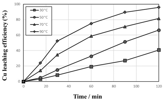 Figure 3 shows the effect of agitation speed on the leaching efficiency of Cu to examine the effect of liquid film boundary diffusion surrounding the solid particles on the dissolution efficiency in 1 mol/L sulfuric acid solution at 90 °C with 10,000 mg/L Cu2+, 1% pulp density, and 1000 cc/min O2 introduction. The dissolution efficiency increased gradually with leaching time, and the higher leaching efficiency was obtained at a higher agitation speed. Similar dissolution behaviors of Cu were observed in the leaching test with 600 rpm and 800 rpm. Therefore, in all subsequent leaching tests, a working agitation speed of 600 rpm was selected to provide effective particle suspension in the solution. The effect of temperature (30–90 °C) was investigated in 1 mol/L sulfuric acid solution at 600 rpm with 10,000 mg/L Cu2+, 1% pulp density, and 1000 cc/min O2 introduction, and the result is presented in Figure 4. The elevated temperatures yielded higher dissolution rates of Cu from PCBs, and the leaching efficiency of Cu at 90 °C increased gradually to 96.0% within 120 min.