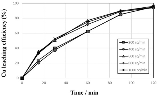 As discussed above, the leaching of Cu was improved by adding Cu2+ and O2, where the O2 used in the leaching reaction indicates dissolved oxygen. Generally, the concentration of dissolved oxygen in water decreases with increasing temperature, and the oxygen was introduced continuously into the reactor during the leaching tests. The effect of the O2 gas flow rate was investigated in 1 mol/L sulfuric acid solution at 90 °C and 600 rpm with 10,000 mg/L Cu2+, 1% pulp density, and 200–1000 cc/min O2 introduction. The results presented in Figure 5 indicate that the leaching efficiencies of Cu increased gradually up to 95% in all flow rates, but the tests with less than 400 cc/min showed a slower leaching rate. As oxygen plays a role of oxidant for the oxidation of cuprous ion (Cu+) to cupric ion (Cu2+), as shown in Equation (4), it is important to provide sufficient oxygen into the leaching system. Therefore, 1000 cc/min flow rate of oxygen was selected in further leaching tests.