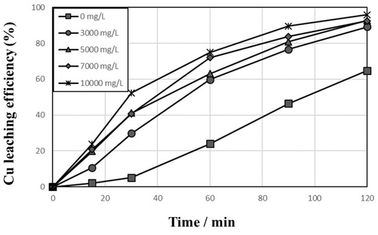 Leaching experiments were carried out to investigate the effect of initial cupric ion concentration as an oxidant for the dissolution of Cu metal in 1 mol/L sulfuric acid solution, temp. 90 °C, agitation speed 600 rpm, Cu2+ concentration 0–10,000 mg/L, pulp density 1%, and flow rate of O2 in solution1000 cc/min. Equation (4) represents the chemical reaction of Cu leaching, where Cu2+ ion acts as an oxidant for the dissolution of Cu metal. Figure 6 indicates that the leaching efficiencies of Cu increased gradually with time and the Cu2+ concentration; therefore, the use of Cu2+ is favorable for Cu metal leaching in sulfuric acid solution. When no Cu2+ was added to the leaching system (0 mg/L initial Cu2+ in Figure 6), the leaching efficiency of Cu increased up to 64.7% and was comparatively slower. As discussed above, partly oxidized Cu could be dissolved in sulfuric acid solution and the dissolved Cu ions could act as an oxidant for Cu metal leaching.