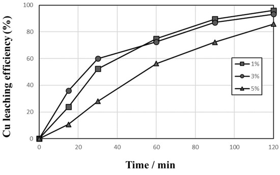 In Figure 7, the effects of pulp density on the leaching behaviors of Cu were investigated in 1 mol/L sulfuric acid solution at a temp. of 90 °C and agitation rate of 600 rpm with Cu2+ concentration 10,000 mg/L, pulp density 1–5%, and flow rate of O2 addition 1000 cc/min. The leaching efficiency of Cu increased rapidly with the decreasing pulp density. The leaching efficiency with 1% pulp density increased slower in the beginning of leaching than that with 3% pulp density, but they show similar leaching behaviors after 60 min. The leaching efficiency with 5% pulp density was retarded. If all Cu metals in the PCBs samples dissolved, the Cu concentrations of sample were found to be 3170 mg/L, 9510 mg/L, and 15,850 mg/L at 1%, 3%, and 5% pulp density, respectively. In Equation (4), 1 mol of Cu2+ should be required to oxidize 1 mol of Cu metal (the stoichiometric mole ratio is 1). Because the initial Cu2+ concentration was 10,000 mg/L, in the case of 5% pulp density, the initial Cu2+ concentration was not enough to oxidize all the Cu metal from PCBs samples, but the dissolved Cu could be changed into Cu2+ ion, as shown in Equation (4), and the leaching efficiency with 5% increased to 85.8% in 120 min, even though it was slow.