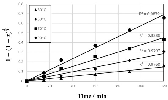 Plot of 1 − (1 − x)1/3 vs. T as a function of time for Cu leaching at temperature 30–90 °C in 1 mol/L sulfuric acid solution.