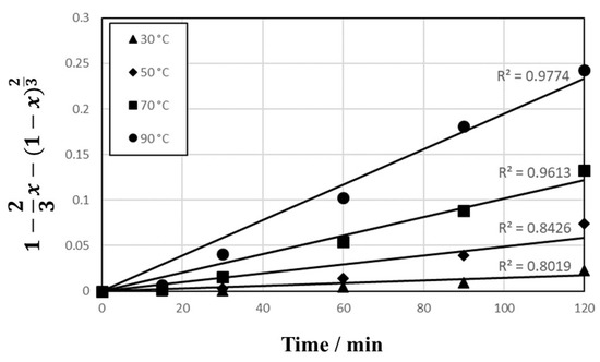 Plot of 1 − 2/3x − (1 − x)2/3 vs. T as a function of time for Cu leaching at temperature 30–90 °C in 1 mol/L sulfuric acid solution.