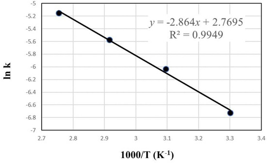 The data in Figure 4 were fitted to the models as shown in Figure 8 (reaction-controlled model) and Figure 9 (diffusion-controlled model). The correlation coefficients (R2) are 0.9768 to 0.9879 in Figure 8 and 0.8019 to 0.9774 in Figure 9, respectively, which indicate that the reaction-controlled model is more suitable to this leaching behavior than the diffusion-controlled model. Generally, PCB has a multi-layered structure composed of copper foil and resin. However, as shown in Figure 10, because the copper in PCBs was exposed during extensive milling with cutting and mixer mills, the reaction-controlled model is suitable for this PCBs’ leaching. Rate constants (k) for different temperature were calculated by plotting Figure 8, and the Arrhenius plots using the rate constants over T−1 are presented in Figure 11, where the activation energy is found to be 23.8 kJ/mol. The activation energy is similar to the data reported in conventional studies [14,42,43,44], which indicate that the leachate containing sulfuric acid with Cu2+ is effective for Cu leaching.