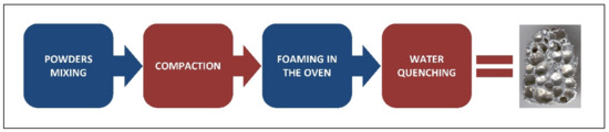 The cylindrical specimens, made of Al foam with closed cells, were produced through the compacted powder method (Figure 1), assuming the process parameters developed in previous work [42]. Commercially pure Al powder (44 µm average diameter) was mixed with TiH2 powder as a foaming agent (5 μm average diameter) and SiC powder (37 μm average diameter), added to increase viscosity and stabilize porosity by acting at the interface metal-bubble.