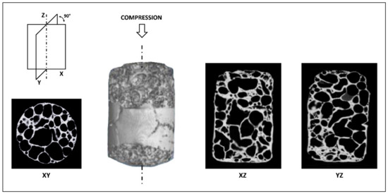 For the tomographic observations, a YXLON device-model Y-CT Vario (YXLON International GmbH, Hamburg, Germany) was used, working at an acceleration voltage adjustable up to a maximum of 225 kV, in the range microfocus-macrofocus by changing the spot size from 250 to 800 μm, in order to give priority to the spatial resolution (from 30 µm to 200 μm), or to the penetration capacity in materials with high absorption coefficient (up to 10 mm in the case of ferrous alloys), or to an object under examination with great size (up to diameter of 180 mm and height of 250 mm). In our specific case, the observations on the Al foam specimen were carried out at an acceleration voltage of 150 kV, with a spot size equal to 250 μm. The detector system was a flat panel with a resolution of 1920 × 1536 pixel.