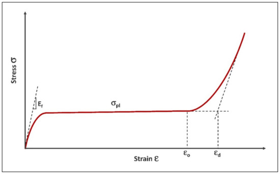 In Figure 3, the typical compressive stress–strain curve for foams is reported, with reference to elastic-plastic behavior such as that of metal foams [15]. Three different regimes can be identified: