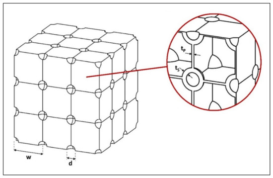 Introducing this model, the relative density ρf/ρs can be calculated as a function of the diameter d and the wall thickness ts of the hemispherical section of the smaller spheroidal cells, and the width w and the wall thickness tp of the cruciform section of the larger prismatic cells [19]: