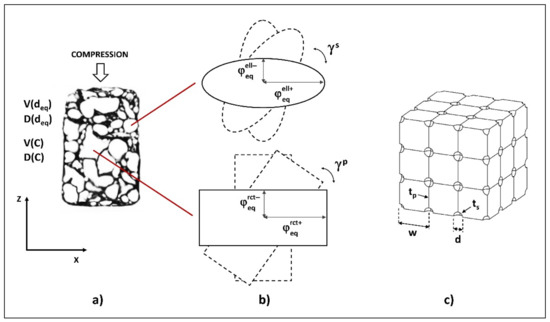 The couples of average values (dpeq,Cp) and (dseq,Cs), for the prismatic and spheroidal cells respectively, obtained by the distributions of the local morphological parameters of the real cellular structure, are used to define the geometric parameters of an intermediate virtual model, where the sections of large and small cells are not yet circular and square such as in the final reference model of Figure 4, but instead they are elliptical and rectangular respectively (Figure 5b). By means of this intermediate model it is possible to partly take into account the asymmetry of the cells, and their orientation with respect to the z axis of the analyzed section, that is parallel to the direction of compression.