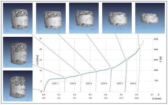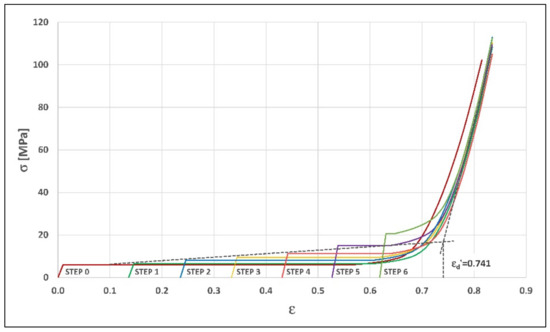 The deformation reached at each step was calculated with respect to the height of the specimen in the initial condition (Step 0), and the loading curves of the steps were assembled in sequence in order to obtain the continuous stress–strain curve that represents the overall compression behavior.