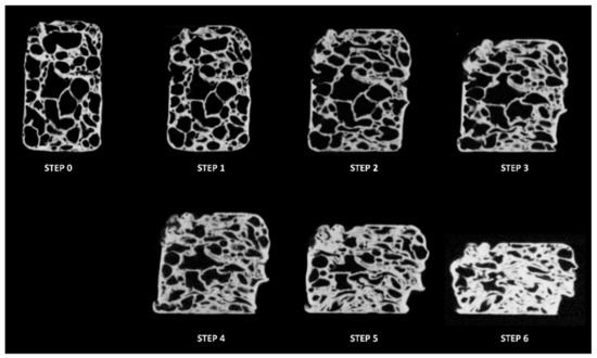 The starting cells morphology was observed by means of variable focus computed tomography (CT) for all the specimens, while the evolution during compression was investigated for the 0.4% TiH2 specimen only. It allows for building a virtual model of the specimen at the starting state (Step 0) and at each compression step with a high density of points (some millions), giving information on the internal volume that otherwise would be not accessible [44]. The specimen to be inspected is put in rotation within the radiation cone produced by an X-ray source. The distribution of the radiation intensity that crosses the specimen is measured by a flat panel detector and digitally acquired.