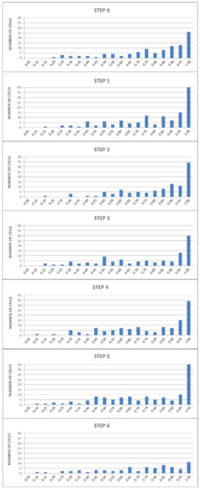 The second result of the morphological analysis, that is the distribution of circularity C throughout the cells in section, can be processed analogously. As in Equations (4) and (5), it can be expressed by the vector V(C) of the maximum values that limit each range of C values defined for the frequency analysis, sorted by increasing values, and the vector of frequency distribution D(C) per range of values: