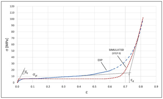 As a general observation, the more complex computational approaches based on FE modeling are hardly able to accurately simulate the whole spectrum of regimes that arise during the compression of cellular structures (linear elastic deformation, plastic collapse, densification), generally achieving greater accuracy in the second one, although there are examples in which a good fit of the experimental curve in the densification zone [31] or an acceptable agreement in the linear elastic region [32] is obtained.