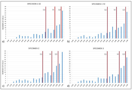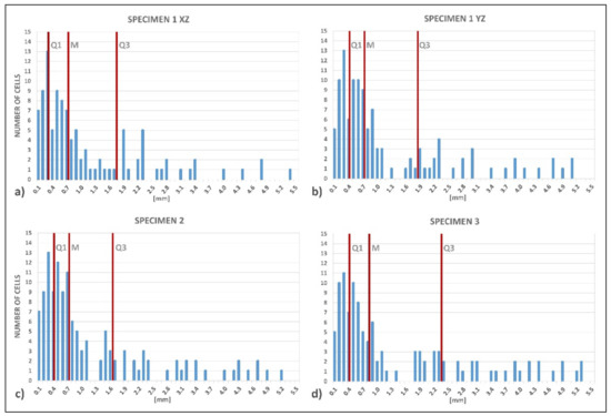 It is assumed that the results of the morphological analysis on a section of the cellular structure (e.g., section XZ in Figure 5a) are the distributions of the equivalent diameter deq and the circularity C throughout the cells in section. The distribution of deq can be expressed by the vector V(deq) of the ranges of the deq values defined for the frequency analysis, sorted by increasing values, and the vector of frequency distribution D(deq) per range of values: