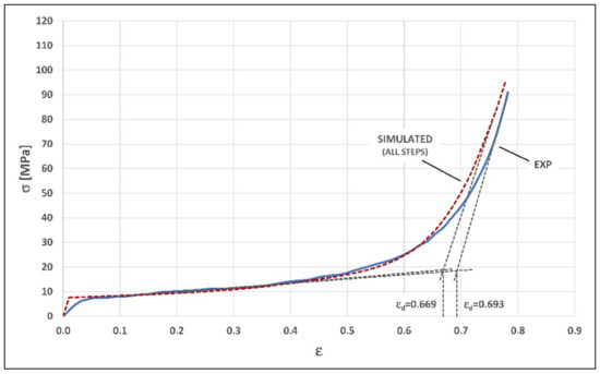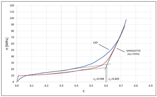 Therefore, for one of the produced foams (0.4% TiH2, 2.8% SiC), the analysis of the evolution of the cells’ morphology during deformation up to the final densification was carried out at different levels of compression by X-ray CT observations. The correlation model was fitted with regard to the morphology of each compression step, and the simulated stress–strain curve was obtained by enveloping the curves obtained for each step. When compared to the experimental one, a good level of approximation of the whole curve was found, with a realistic description of the behavior up to the final densification. In particular, a full congruence between the theoretical and experimental values of the densification strain, with a limited deviation in stress values of the densification curve, was achieved.