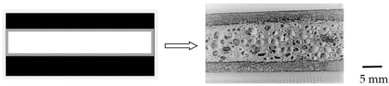 The foam core of the AFS panel has been manufactured starting from a precursor of AlSi10 containing 0.8% of foaming agent (TiH2) and 4% of stabilizing agent (SiC). After mixing, the powders have been compacted to obtain a precursor which is successively foamed in the oven [15]. In comparison with pure Al foam, it has been necessary to increase the content of both additives to the Al alloy powders. Furthermore, due to the higher mechanical strength of Al–Si alloys, in comparison with pure Al, it has been necessary to increase the compaction pressure from 12 to 15 t, corresponding to a compaction pressure of about 600 MPa. The process is schematically illustrated in Figure 1. AFS panels have been prepared with two sheets of AlSi 316 L (4 mm thickness) and a precursor of AlSi10.