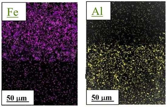 The structure of the foams and the AFS panels are shown in Figure 2. Macro observation reveals a good quality of the joints at the interface: no cracks and other macro defects were observed. As the mechanical properties of the AFS strongly depend on the extension of the chemical interdiffusion, EDS maps of the main alloying elements in the skin (Fe) and in the foam (Al) have been acquired (Figure 3). These maps show an inter-diffusion process of both chemical elements, with a thickness ranging from 30 to 80 μm occurred during the foaming process.