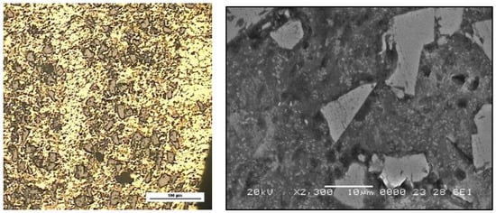 The microstructure of the AlSi10 foams has been analyzed by optical microscopy (OM) and SEM observations. In Figure 6, examples of microstructure are shown. The fine eutectic structure of the Al alloy can be evidenced in the optical microscopy observations surrounded by SiC particles. On the other hand, the edgy shape of the SiC particles can be better highlighted in SEM observation at higher magnification (2300 X), coincident with the particle size (400 mesh, max 37 μm–Sigma Aldrich) of the base powders. This circumstance can be evidenced in Figure 6 left (OM) and right (SEM).