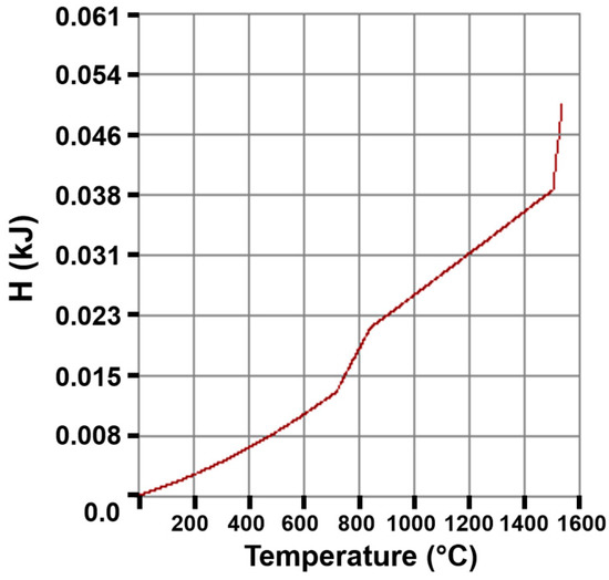 The calculation of transformation temperatures for steel (temperature of liquidus, TLiq, temperature of solidus, TSol, upper transformation temperature, TAR1, and lower transformation temperature, TAR3) is through Equations (3)–(6) as a function of the steel chemical composition [22]. Therefore, Equation (7) calculates the corresponding energy required to melt the steel (Hi,j) [3,15,22]. Here, (w) is the weight of each discretized steel element obtained using Equation (8). A graphical representation of the energy calculated for a steel volume is in Figure 2.