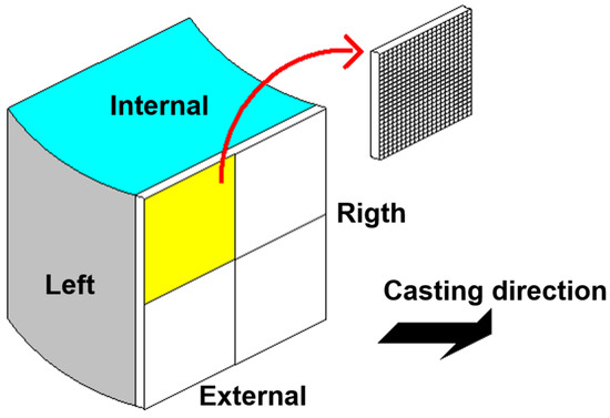 Some authors simulated the billet thermal behavior during CCP considering only ¼ or ½ of the cast section and assuming the symmetric heat removal as is described in Figure 3 [1,2,3,4,10,13,14,15,16,17]. Heat removal takes place only through the lateral surfaces and there is a heat conduction assumption on the rest of the sample. Formerly, the application of this procedure was limited due to computer capacities at the time.