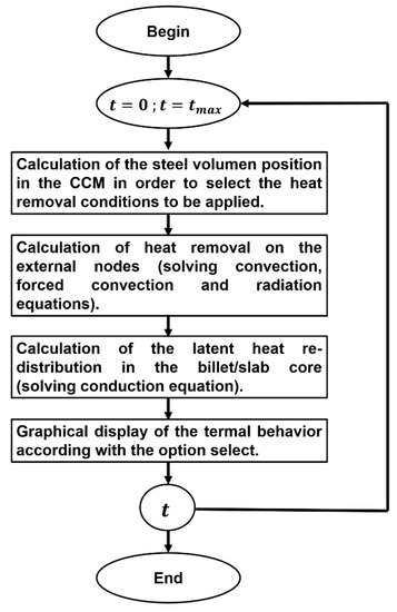 The counting of iterations includes the entire algorithm-loop to calculate the heat transfer and corresponding routines for both displaying and saving the information nested inside. Every iteration corresponds to the results obtained after updating the actual simulation time with the step time (t = t + Δt). The step time (Δt) obeys the criterion given by Equation (2) and its estimation is through the casting speed by knowing the dimension (Δz) of the steel volume control.