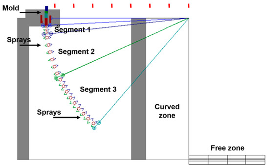 Figure 15 shows a layout of a CCM used for casting steel slabs. It is more significant than a billet caster and there are more segments in the SCS because a bigger steel volume needs a longer quenching process. Furthermore, cast speeds are also slower than those for casting billets due to the same reason. The general casting conditions are in Table 6, while the CCM geometry and operating conditions are in Table 7 and Table 8, respectively. Table 7 is divided into two sections to identify the values for the curved and straight zones. Here, (ds) is the distance from the nozzle to the slab surface and this is a known data, while (dw) and (dnw) are calculated in addition to the sprayed and non-sprayed distances. The sub-index (zn) is the identification of a segment.