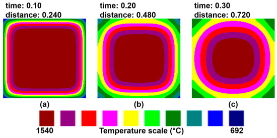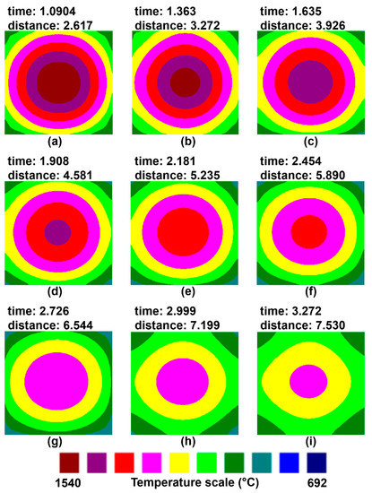 In the third segment, the water flow rates and number of sprays along the cast direction were different. Then, four curves were displayed in this segment due to the different sprays and water flow rates used to quench each billet surface. Figure 9a–c show the corresponding temperature profiles in the mold. These figures are symmetrical due to the same heat removal conditions applied to the four billet surfaces. The corresponding temperature profiles to the SCS are in Figure 10a–i. Here, the symmetry of the profiles inside the mold is slowly missed. In Figure 10a,b, the circles in the core billet are deformed and the isothermal regions near corners are different and not symmetrical. In Figure 10h,i, the circular isotherms are deformed and moved toward the surfaces with the highest removal heat; furthermore, the isotherms adopt a hyperbolic shape, evidencing the non-symmetrical heat removal pattern, including the liquid core.