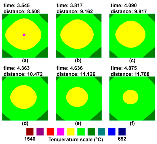 Finally, at the end of the SCS, the temperatures of the four surfaces tended to homogenize due to the heat removal by radiation out the SCS, which is less intense, and the heat conducted redistributed inside the billet core. Figure 11a–f show the temperature profiles in the free or radiation region of the CCM. Here, the latent heat inside the billet core was slowly distributed, tending to adopt a homogeneous temperature. Figure 8 shows the thermal conditions of the surface at the end when the billet was driven out of the CCM.